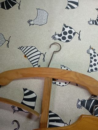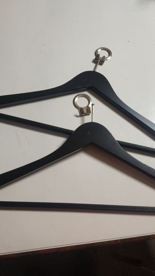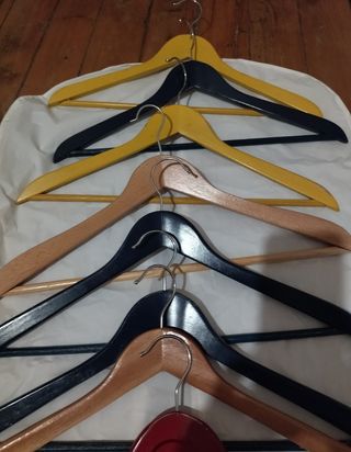 Se venden diez perchas de madera en colores marrón y negro. Son resistentes y están en buen estado. - Ideales para guardar ropa. - Madera de calidad. - Ganchos metálicos.