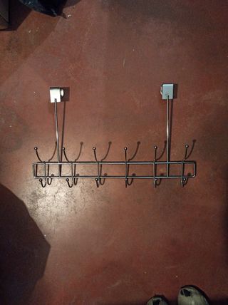 perchero o percha para colgar en la puerta. Son de metal negro y madera, con un diseño sencillo y elegante. - Se encuentran en buen estado. - Perfectos para organizar abrigos, bolsos u otros objetos.En la foto se ve puesto en la puerta de un armario pero también se ponen en las puertas de paso. Tengo dos, precio por unidad. Las dos por 8€