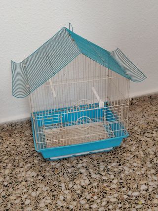 Jaula pajaros azul y blanca
