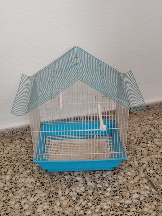 Jaula para pájaros con un diseño de casa. - Estructura de alambre. - Bandeja de plástico. - Dos perchas incluidas.