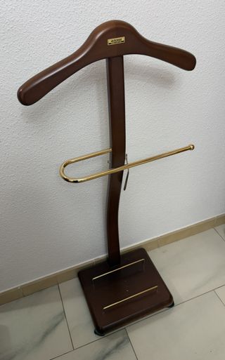 Preciosa percha de pie, ideal para dormitorio o recibidor. Se pliega para facilitar su guardado. - Estructura de metal y madera. - Diseño elegante y funcional. - Perfecto estado de conservación.