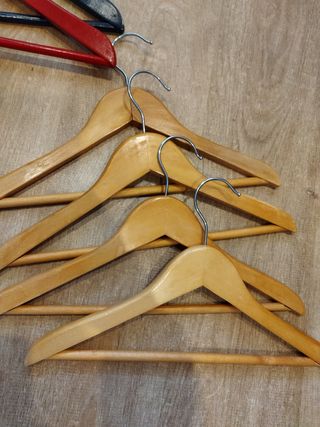 Vendo cuatro perchas de madera. Son ideales para organizar tu armario. También para manualidades, decorar perchas, pintar perchas. - Están en buen estado. - Hechas de madera y colgador de metal. - Perfectas para ropa de diferentes tipos.