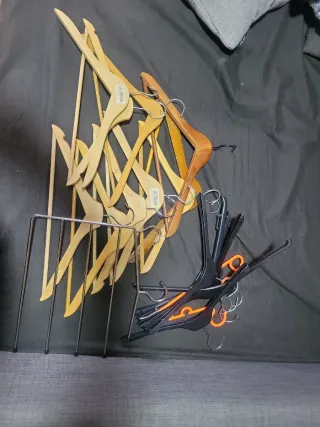 Conjunto variado de perchas para organizar tu armario. -10 Perchas de madera en tonos marrones y claros. -6 Perchas de plástico negras -1 Soporte metálico para colgar.