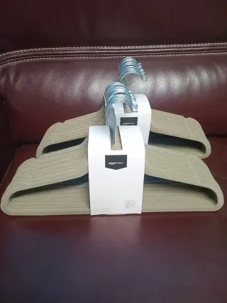 Conjunto de 30 perchas de terciopelo de Amazon Basics. - Color gris y ganchos plateados. - Materiales: metal y terciopelo. - Para ropa de adulto. - 15 Perchas 12 €. - 30 Perchas 20 €.