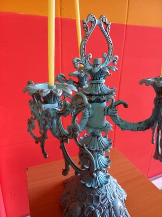 Lámpara echa candelabro. De bronce pintada en azul vintage con sus velas y de regalo un paquete de velas con sus soportes. MIRA MI PERFIL!!! HAY DE TODO. no leer: led iluminacion barras focos lámparas bombillas plafón aplique electricidad herramientas silla sillón sofá taburete chaise longue cómoda mesa mesita sinfonier espejo estantería estante percha armario cuadro vinilo papel pintado televisión radio tdt VHS antena cable