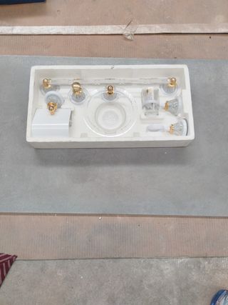 Toallero ducha, toallero lavabo, jabonera y percha. ( Toallero lavabo,tiene un pequeño defecto en la porcelana. )