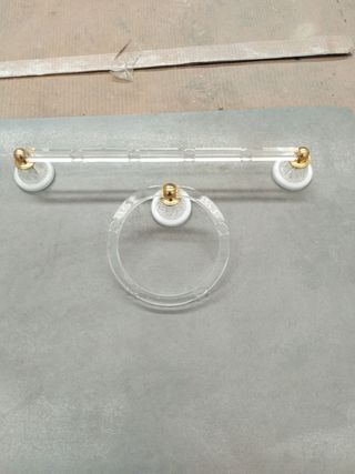 Vendo juego de accesorios de baño en color blanco, con decoración en cristal y dorado. Los toalleros son de metacrilato cuadrado (los tengo también en redondo trenzado en otro anuncio). portarrollos toallero aro 19cm toallero barra 51cm percha portavasos colgar porta jabonera colgar Dispongo de dos juegos completos.