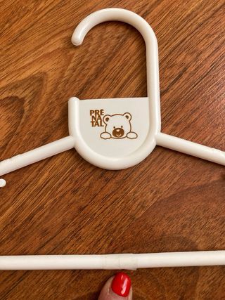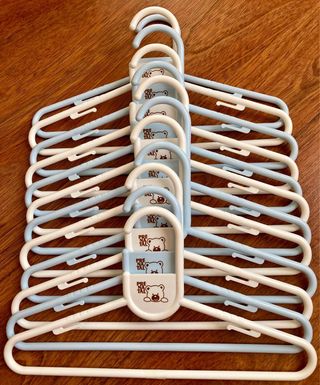 Lote 12 perchas Prenatal blancas y azules (6 azules y 6 blancas). Una blanca tiene un celo porque se rompió pero se ha seguido usando sin problema.