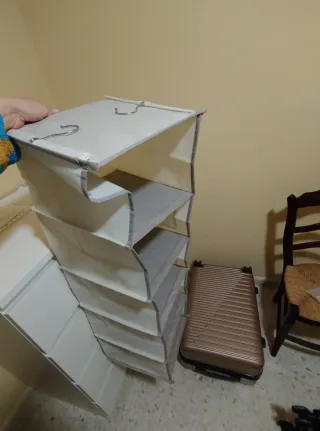 Organizador colgante de tela con cinco compartimentos y dos bolsillos laterales para mantener tus pertenencias ordenadas. - Diseño de 5 estantes. - Incluye perchas para colgarlo fácilmente.