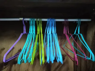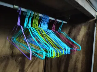 Perchas de colores: 2 moradas 4 burdeo 10 turquesa 11 azules 5 verdes Son perchas de alambre recubiertas de plástico en perfecto estado NOTA: Si alguien tiene preferencia de colores que escriba