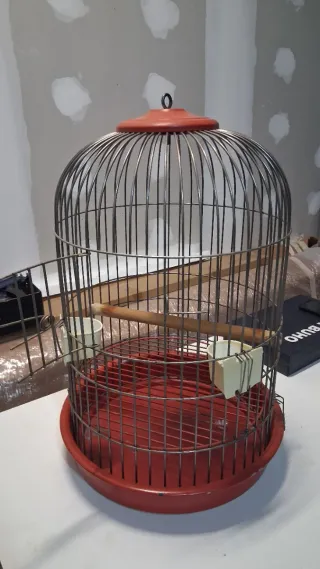 Jaula metálica de diseño redondo, adecuada para pájaros o loros. - Estructura de alambre. - Bandeja inferior roja. - Incluye percha de madera. TIENEN QUE VENIR A RECOGERLA
