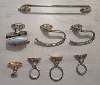 1 Toallero grande,2 Toalleros ovalados, 1 Portarollo,1 Percha y 3 Sujetatoallas o porta botes de jabón.