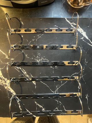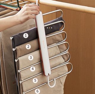 Organizador de ropa para colgar pantalones de forma eficiente. - Diseño de 6 niveles para maximizar el espacio. - Estructura robusta y duradera. Percha organizadora múltiple ideal para pantalones, vaqueros, faldas o bufandas. Diseño inteligente que permite colgarla en horizontal o en vertical, ahorrando mucho espacio en el armario. ✔ Barras de acero inoxidable ✔ Capacidad para 6 prendas min. ✔ No marca la ropa ✔ Fácil de usar y muy resistente ✔ Ideal para armarios pequeños Producto nuevo, sin usar. Envío rápido.