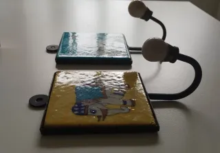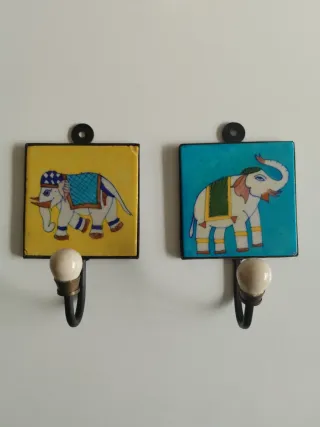Conjunto de dos perchas decorativas con diseño de elefantes, inspiradas en el arte indio. Cada percha presenta un azulejo de cerámica con un elefante pintado y un gancho de metal. - Diseño de elefante en cada azulejo. - Combinación de cerámica y metal.