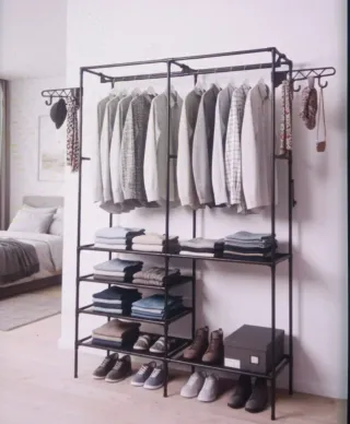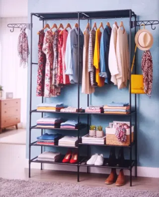Práctico perchero burro para organizar tu ropa y accesorios. Ideal para vestidores o habitaciones. - Estructura de metal resistente. - Múltiples perchas para colgar prendas. - Estantes inferiores para zapatos o cajas.