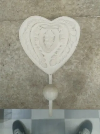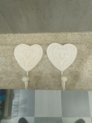 Set de dos perchas decorativas con forma de corazón. Añaden un toque encantador a cualquier espacio. Compradas en tienda de decoración - Diseño de corazón con detalles. - Acabado en color blanco, lacadas