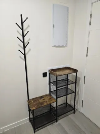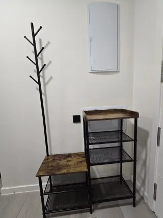 Práctico perchero de pie con zapatero integrado, ideal para la entrada o recibidor. - Estructura de metal resistente. - Diseño moderno y funcional. - Dos niveles de estanterías para zapatos. - Múltiples ganchos para abrigos y accesorios. El zapatero nunca se usó de zapatero. Se entrega en Valdemoro