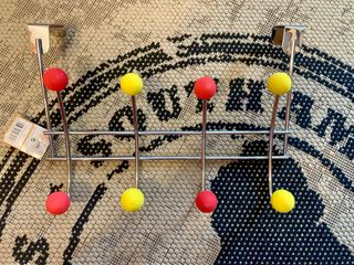 Colgador de puerta de metal con 8 ganchos. Tiene bolas de colores rojo y amarillo en los extremos de los ganchos. Ideal para colgar abrigos, bolsos u otros objetos. - Diseño moderno y elegante. - Estructura metálica resistente. - Ocho ganchos para mayor capacidad.
