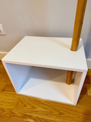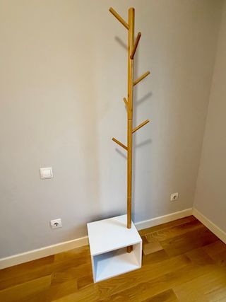 Este perchero combina un diseño natural con funcionalidad. Está impecable, prácticamente sin uso. - Estructura de madera. - Base de almacenaje en forma de cubo blanco.