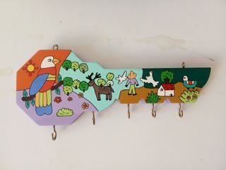 Perchero de madera con forma de llave, para colgar llaves. Es artesanía de Sudamérica, El Salvador, pintado a mano, estilo naif #artesania #artesaniaenmadera #artesaniasudamerica #elsalvador