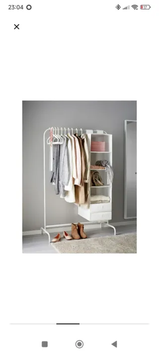 Práctico burro perchero de IKEA, ideal para organizar tu ropa y accesorios. - Estructura metálica. - Organizador de tela con varios compartimentos.