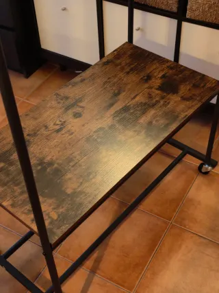 Práctico perchero de metal con ruedas.. Ideal para organizar ropa y accesorios. - Estructura de metal y plástico. - Dos niveles de estanterías. La balda si se le pone mucho peso se escurre, pero ya era así cuando la compré. Para solucionarlo la bloqueaba con unas gomas. - Ruedas para fácil desplazamiento. Las sobrecubiertas de las ruedas están mordisqueadas, pero no impide su movimiento. - La altura es modulable 90-150 cm (hay fotos de la caja para comprobarlo)