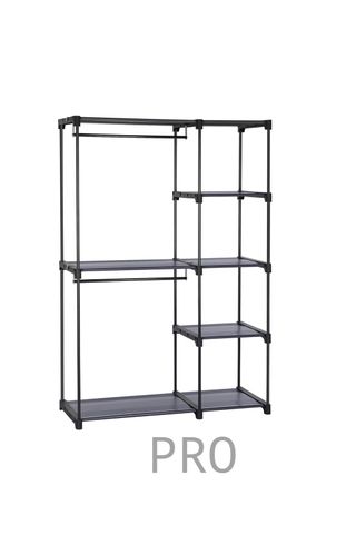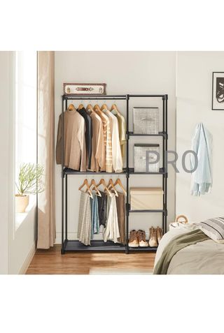 Armario organizador con estructura metálica y cubiertas de tela. - Incluye cortinas para cubrir la ropa. - Dispone de cajas de almacenamiento. - Diseño moderno y funcional.
