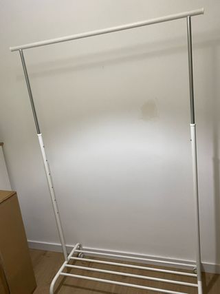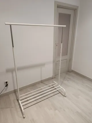 NUEVO, en su CAJA CERRADA. 💡 Muy práctico si necesitas espacio extra para colgar ropa o una solución temporal sin hacer agujeros. • Altura regulable (varias posiciones). • Con ruedas para moverlo fácilmente. • Estructura metálica resistente. • Estante inferior para zapatos o cajas. • Ganchos laterales para bolsos o prendas largas. • Color blanco, diseño minimalista IKEA. 📦 Estado: nuevo a estrenar 📏 Medidas: 111 × 51 × 126–175 cm aprox. ⚖️ Soporta hasta: 35 kg