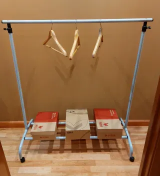 Práctico perchero con ruedas para colgar ropa. - Estructura de metal resistente. - Diseño moderno y funcional. - Base con balda para zapatos o accesorios. - Ruedas para fácil movilidad. - Tengo más unidades.