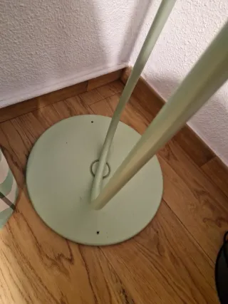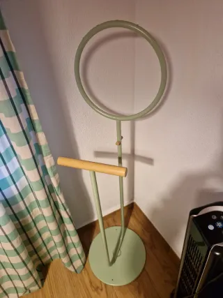 Este elegante galán de noche de IKEA combina funcionalidad y diseño. - Estructura principal en metal verde. - Barra superior de madera. - Base circular estable. Tiene unos agujeritos porque fue de exposicion