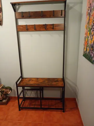 Este perchero combina un diseño moderno con funcionalidad. - Estructura robusta de metal. - Superficies de madera con acabado rústico. - Dos niveles de estantes para zapatos o accesorios. - Múltiples ganchos para abrigos y sombreros.