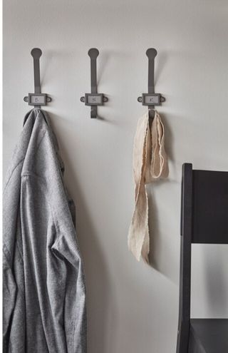 Perchero de pared de Ikea con un diseño moderno y funcional. - Fabricado en metal resistente. - Color negro mate. - Múltiples ganchos para colgar abrigos, bolsos o sombreros.