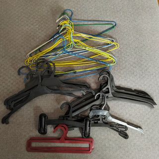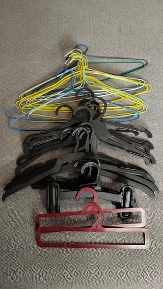 Conjunto de perchas de diferentes tipos, colores y formatos. - 16 Perchas de metal de colores (amarillo, azul, blanco, verde). - 19 Perchas de plástico (negro y rojo).