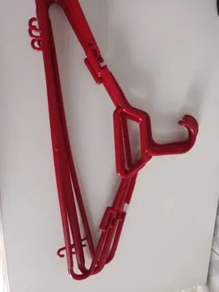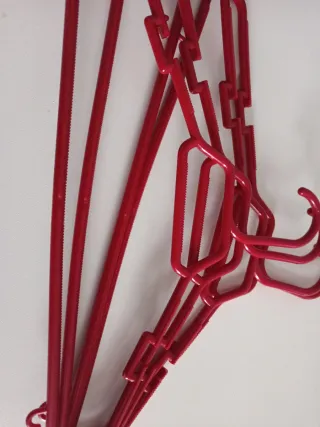 Conjunto de cuatro perchas de plástico. - Diseño resistente. - Color rojo vibrante.