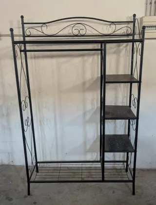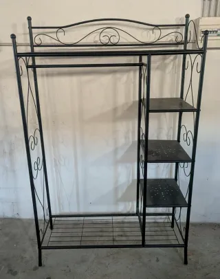 Perchero con estantería. Para recoger en Güejar Sierra-Granada. Hay 2, precio cada uno. - Diseño elegante con detalles ornamentales. - Estructura robusta de metal. - Incluye barra para colgar ropa y varias baldas. - Base inferior de rejilla.
