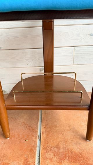 Elegante galán de noche con asiento tapizado y colgador. - Estructura de madera. - Asiento de tela azul. - Colgador de metal dorado.