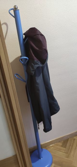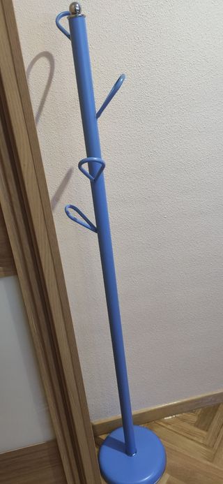 Perchero de pie de metal. 8 colgadores con acabados redondeados. Se encuentra en buen estado. Estructura robusta y estable. Medidas: 177 cm de altura y 38 cm diámetro de la base.