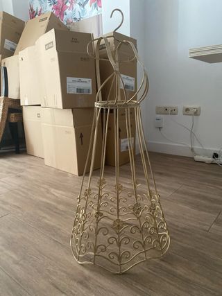 Elegante perchero con un diseño único que simula un vestido. - Estructura de metal con acabado dorado. - Forma de vestido con detalles decorativos en la base. - Incluye colgador superior.
