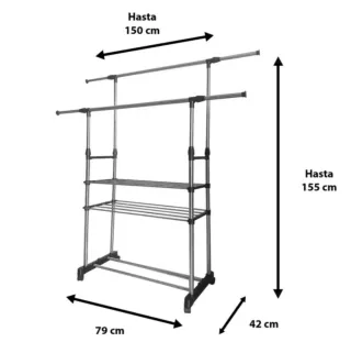 Práctico perchero de doble altura para organizar tu ropa. - Estructura de metal y plástico. - Ruedas para fácil movilidad. - Diseño moderno en negro y plateado.