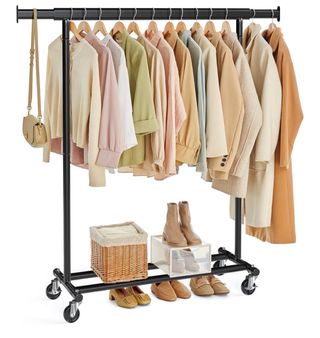 Práctico perchero de pie con ruedas para facilitar su movilidad. Ideal para organizar ropa y accesorios. - Estructura de metal resistente. - Base con barras para zapatos o cajas. - Diseño moderno y funcional.