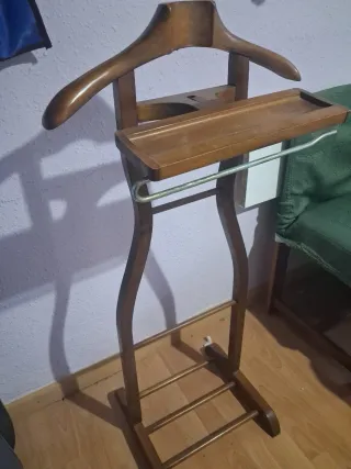 Elegante galán de pie con perchero integrado, perfecto para organizar tu ropa. - Diseño clásico en madera. - Bandeja superior para accesorios.