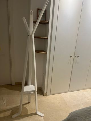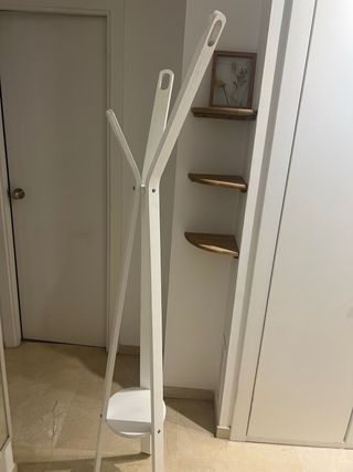 Elegante perchero de pie con un diseño moderno y minimalista. Ideal para organizar abrigos, bolsos o sombreros. - Estructura de madera. - Acabado en color blanco. - Incluye una pequeña bandeja en la base.