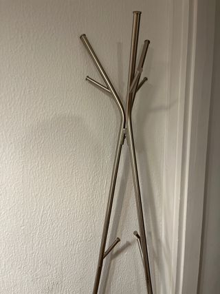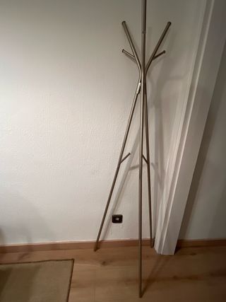 Elegante perchero de pie para la entrada o cualquier estancia. Su diseño metálico le da un toque moderno. - Base estable. - Múltiples ganchos para abrigos y sombreros. - Estructura de metal resistente.