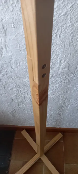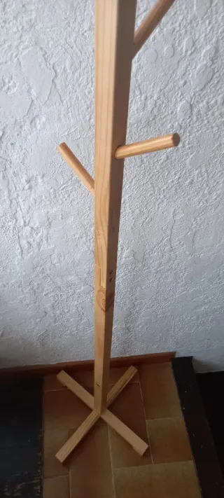 Elegante perchero colgador de pie de suelo de madera maciza de pino con un diseño minimalista, sobrio y funcional. En buen estado, puede tener señales de uso menores propias de la madera.