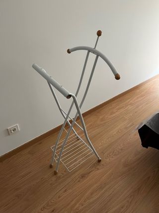 Perchero de pie blanco. Ideal para dormitorios. Se puede doblar. Se encuentra en buen estado. - Dos barras para colgar prendas. - Estante inferior para zapatos u otros objetos.