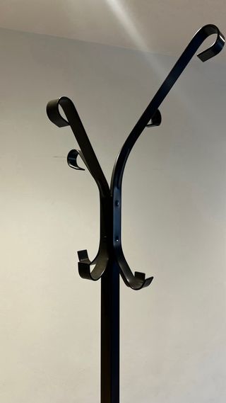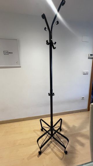 Perchero de pie metálico negro en buen estado. Tiene varios ganchos para colgar chaquetas, bolsos o ropa y base estable. Ideal para recibidor, dormitorio o despacho. Es desmontable y ligero, fácil de mover. Marca Livarno Se vende por cambio de mobiliario. “Precio algo negociable si vienes a recogerlo.”