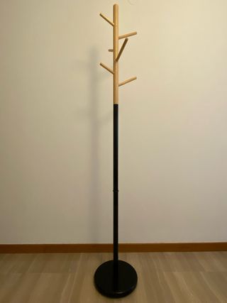 Perchero de pie con un diseño escandinavo. De estilo minimalista nórdico - Combinación bicolor. - Materiales: bambú y metal. - 6 colgadores - Base pesada redonda y estable. - Acabado en color negro y detalles en madera natural. Dimensiones: Altura 171 cm Largo (fondo) 28 cm Ancho (de lado a lado) 28 cm Peso 4,26kg Capacidad de carga 20kg