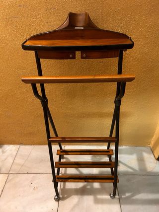 1 Galán de noche de madera y metal. Estilo clásico. Vintage años 70. Tiene compartimento cerrado para corbatas, cinturones, guantes, bufandas,... Tiene colgador para pantalones y percha para chaquetas. Para guardar ropa y accesorios. Estructura robusta y estable. Tiene ruedas. Color original. En buen estado, aunque presenta algunas señales de uso. Mide 117cm alto x 50cm x 35cm. Pesa menos de 10kg. Se envia con la percha desmontada.