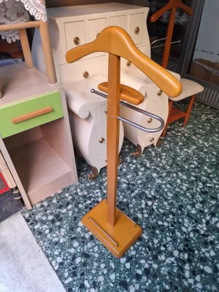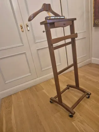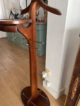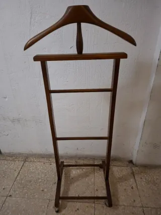 No se hacen envíos ❌ Hay que venir a recoger 🏃 Se vende este elegante galán de noche, que combina la calidez de la madera con la robustez del metal 🪙 Cuenta con perchero superior de madera, barra para colgar pantalones o corbatas, bandeja inferior de madera en el que se incluye un cepillo y base con ruedas para fácil movilidad 🛞 Si está interesado/a, contacte conmigo en chat o a mi WhatsApp (+34 643478193) 📞