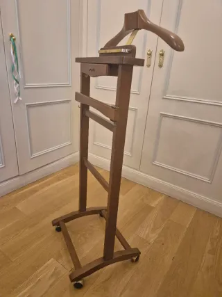 Galán de noche ideal para organizar ropa del día. Estructura en madera maciza, acabado elegante, muy estable. Este galán de noche es perfecto para mantener tu ropa organizada. - Diseño elegante en madera. - Barra para colgar pantalones o accesorios en metal dorado. Estado: muy bueno, sin golpes ni manchas. Recogida en Madrid (zona Plaza Castilla). Disponible para entrega rápida.